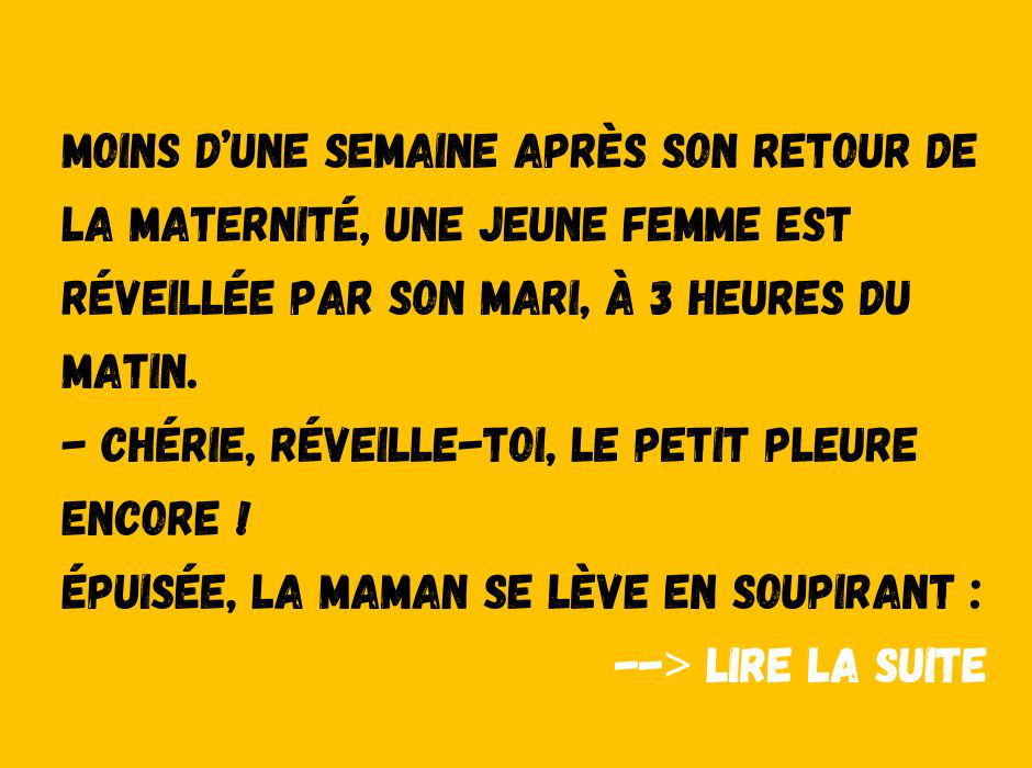 Moins d’une semaine après son retour de la maternité, une jeune femme est réveillée par son mari, à 3 heures du matin.